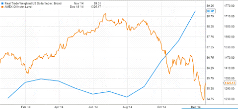 Dollar Index:Broad) и цена корзины AMEX (AMEX Oil Index Price)