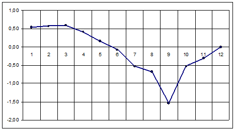 убывающей [1;9) и возрастающей (9;12] тенденции временного ряда.