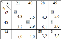 каждой клетке матрицы рассчитывается величина себестоимости перевозок