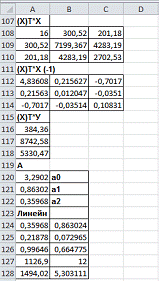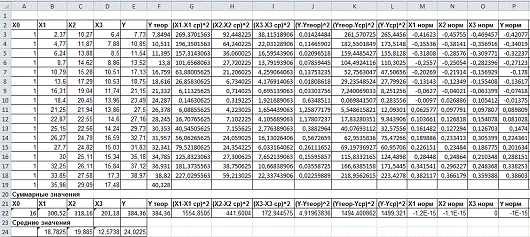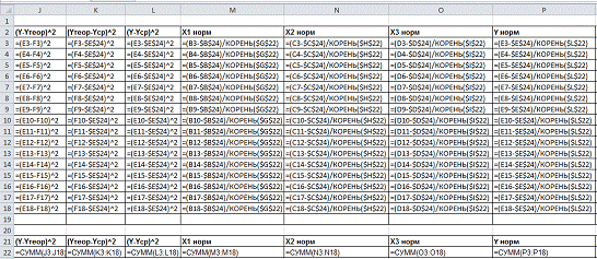 В ячейку F19 вводим формулу =$A$46+$A$47*B19+$A$48*C19+$A$49*D19