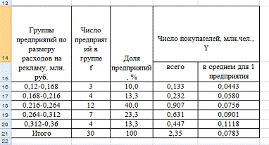 Рис. 12. Таблица 1 для расчета межгрупповой дисперсии