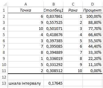 разрахувати ранг і персентель: «Данные» → «Анализ данных» → «Ранг и