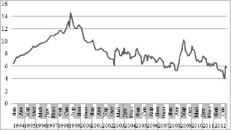 большой уровень безработицы в России (9%) был зарегистрирован в 2009 году.