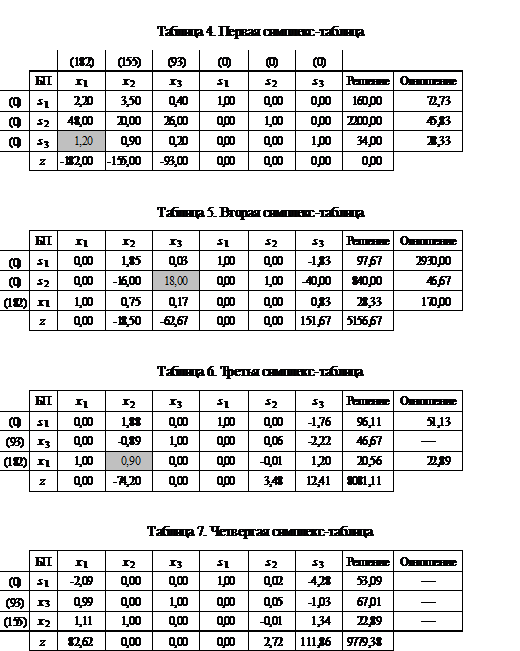Далее следуют третья (табл.11) и четвертая (табл.12) симплекс-таблицы,