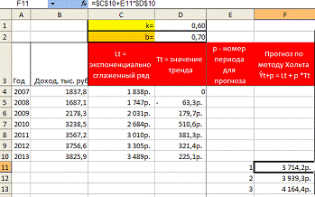 Протягиваем формулу на 3 периода вперед, получаем прогноз
