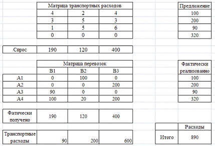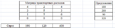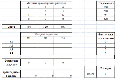 функции транспортной задачи рабочий лист EXСEL примет вид, показанный на