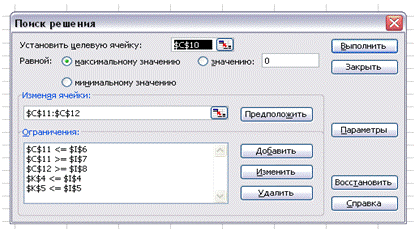 С10 - цільова функція. Вибираємо команду Сервис - Поиск решения. У вікні Поиск