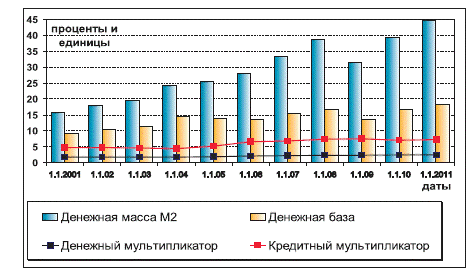 денежная база в процентах к ВВП). Денежный и кредитный мультипликаторы (в
