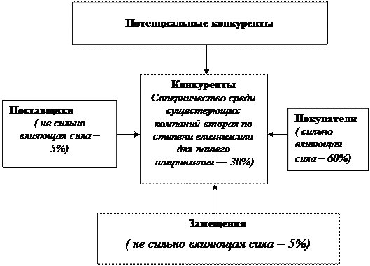 - конкуренция среди существующих фирм (30% влияния). Остальные три силы, хотя