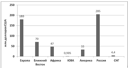 страны Ближнего Востока - 70 млн. долларов США, в страны Африки - 47 млн.