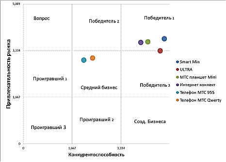 осях Y - стадия жизненного цикла продукта и X относительное положение на рынке