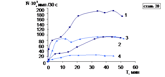времени наводороживания стали 20; 1,2 – закаленные образцы, 3,4 – отожженные