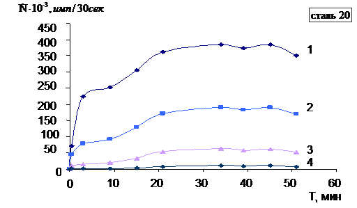 акустической эмиссии отожженного образца при разных концентрациях H2SO4; 1- 0,5н H2SO4, 2- 0,1н H2SO4, 3- 0,01н H2SO4; плотность катодного тока 10 мА/см2,