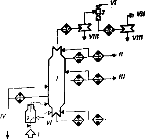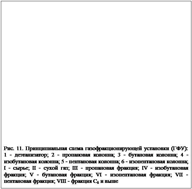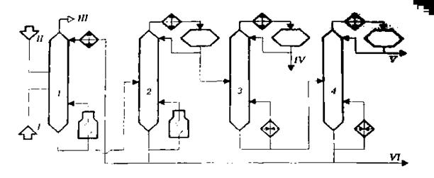 стабилизационная колонна; 3 - пропановая колонна; 4 - бутановая колонна; I - очищенный жирный газ; II - нестабильный бензин; III - сухой газ; IV - пропан-пропиленовая фракция; V -бутан-бутиленовая фракция; VI - стабильный бензин