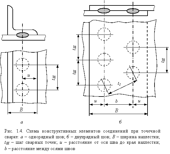 от центра точки или оси шва до края нахлестки u устанавливают по условию отсутствия объемных