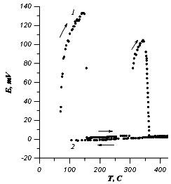 интервале 150 - 280 °С э.д.с. ячейки принимает низкие значения и линейно растет