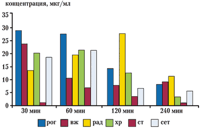 передней камеры наблюдалась через 30 минут и была равна 23,5±1,76 мкг/мл. Через