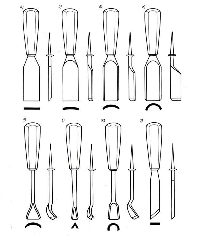 При надрезке верхней дуги стамеску перемещают справа налево, нижней—слева направо. Резать тычком в данном случае