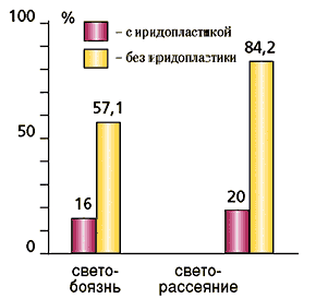 наблюдениям, при удалении 1/3 окружности радужки светорассеяние возникает у 60%