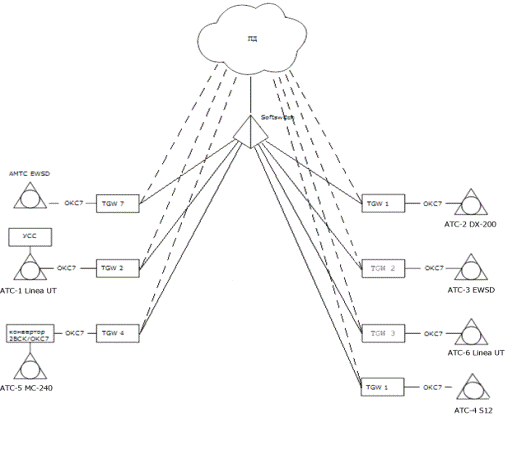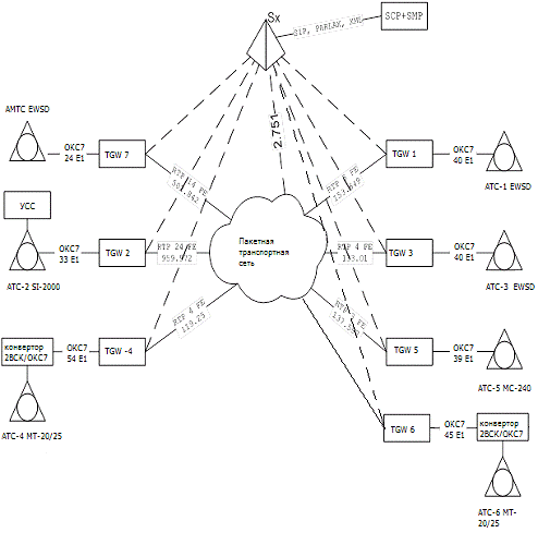 Каждая АТС подключается к сети пакетной коммутации через транспортный