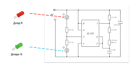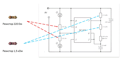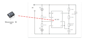 светодиодов. Далее непосредственно сама микросхема 555, которая непосредственно