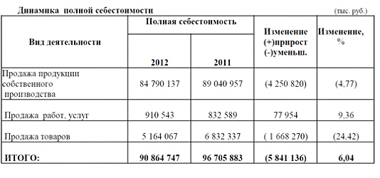 вида деятельности в полной себестоимости за 2011 и 2012 годы: