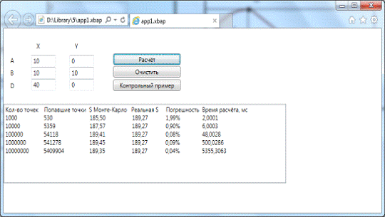 приложение шесть раз повторяет эксперимент и вычисляет площадь фигуры методом