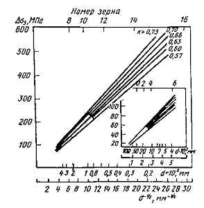 σi - внутреннее упрочнение, МПа;- диаметр зерна, мкм; у - постоянная.