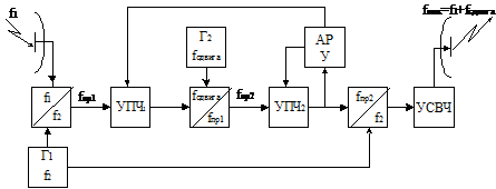 на передачу; СМ1 и СМ2 - смесители; УВЧ и УПЧ - усилители ВЧ (fso) и ПЧ(fпч); Г1 и Г2