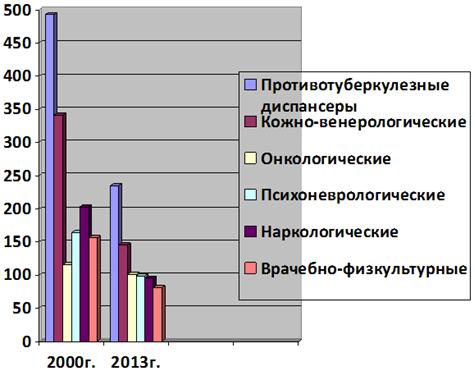 противотуберкулезных диспансеров в 2000 г. составляло 493, а в 2013 г. уже 235,