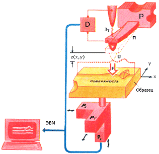 образца под иглой, аPz управляет расстоянием от острия до поверхности, D -