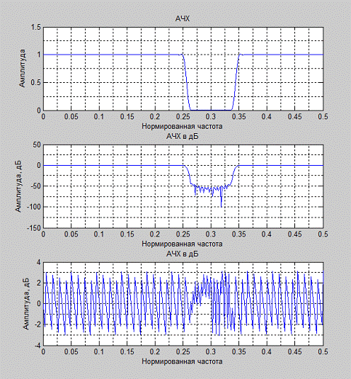 построения графика('АЧХ в дБ');('Нормированная частота'); ylabel('Амплитуда,
