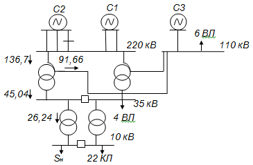 110кВ по шести воздушным линиям мощностью 22/17МВт каждая; на стороне 35кВ по