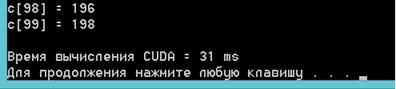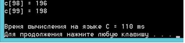 %d\n", i, c[i]);= GetTickCount();(a);(b);(c);= Time2 - Time1;("\nВремя вычисления на языке C = %dms\n", Delay1);