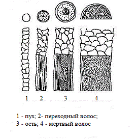 пуха 10-25 мкм, переходного волоса - 30-50 мкм, ости - 50 мкм и более.