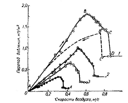 кривые зависимости перепада давления от скорости воздуха (по данным [125]).