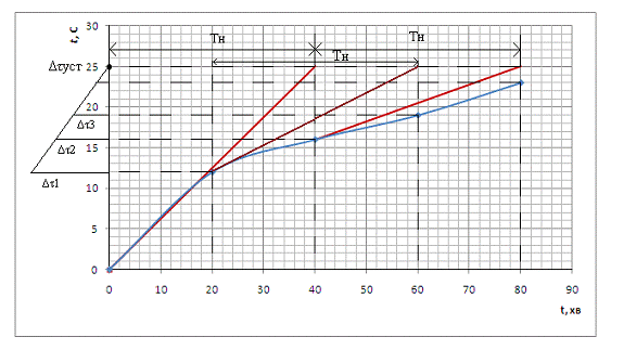 теоретичній та практичній крифих нагріву (теоретична проходить на почтаку
