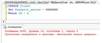 Рисунок 19 - Результат триггера на запрет смены серии паспорта клиента