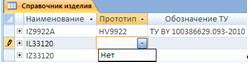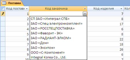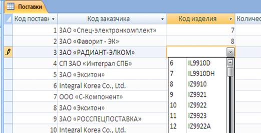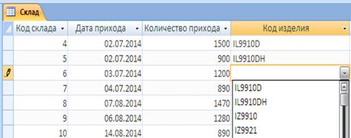 Рисунок 28 – Поле со списком для атрибута «Код изделия» таблицы