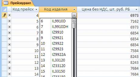 Рисунок 30 – Поле со списком для атрибута «Код изделия» таблицы