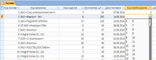Для атрибута «Код прейскуранта» таблицы «Поставки» аналогично создаётся