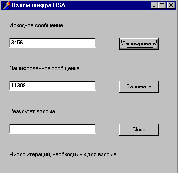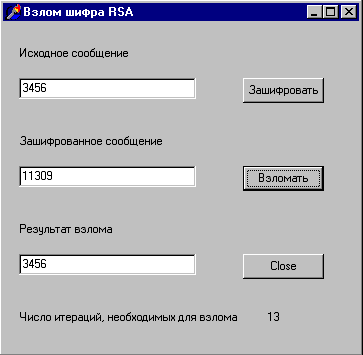 {процедура взлома шифра}:boolean;:integer;:=false;:=1;:=s;{зашифровываем шифр открытым ключом}:=MainForm.Der1(s,e,n);:=StrToInt(ss);:=IntToStr(code);