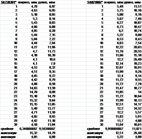 округлыми углами, 4.9-18.3 мкм шириной, 11.5-25.7 мкм высотой (таблица в