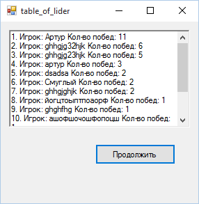 }file = new StreamWriter("Рейтинг.txt");.WriteLine(str);.Close();_of_lider