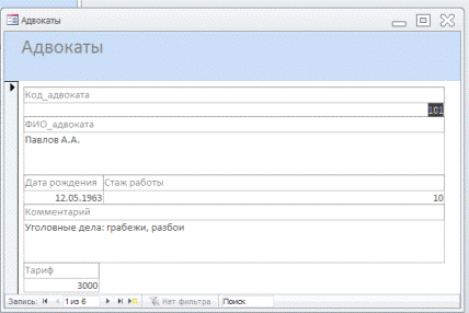 Адвокаты.[Дата рождения], Адвокаты.[Стаж работы], Адвокаты.Комментарий,