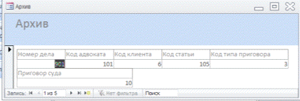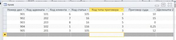 типа приговора] = Архив.[Код типа приговора]);Адвокаты.ФИО_адвоката,