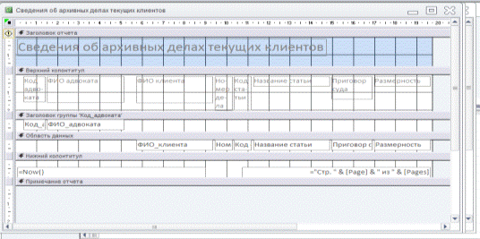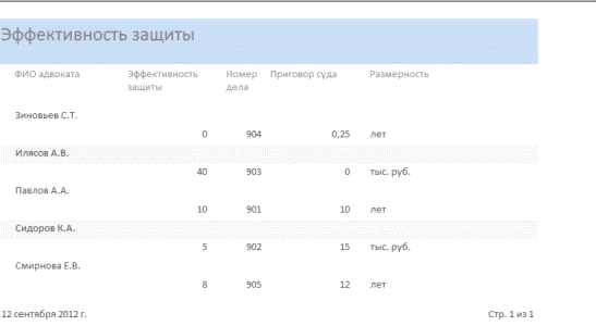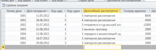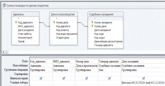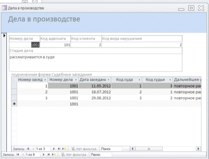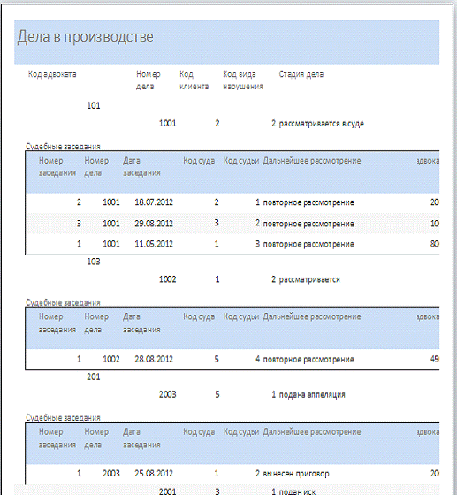 производстве].[Номер дела] = [Судебные заседания].[Номер дела]BY Адвокаты.Код_адвоката,