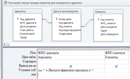 производстве].[Код клиента]) AND (Адвокаты.Код_адвоката = [Дела в