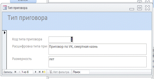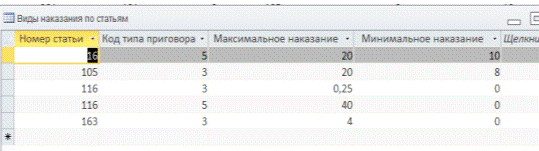 = [Виды наказания по статьям].[Код типа приговора]) AND ([Тип приговора].[Код