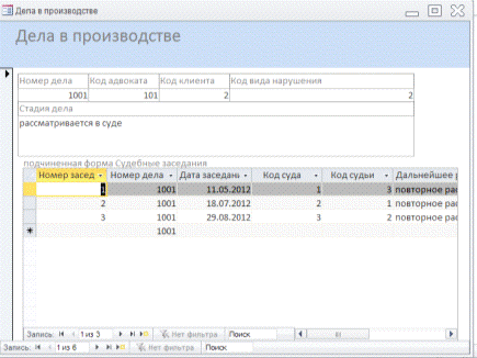 производстве].[Код адвоката]) INNER JOIN [Судебные заседания] ON [Дела в